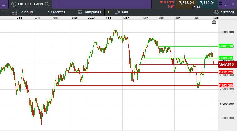 The UK 100 called to open -13 point at 7,548. The UK 100 is expected to open modestly lower today, having fallen heavily on Wednesday with all eyes on the interest rate decision by the Bank of England at midday. The BoE is expected to hike rates by another 25 basis points to 5.25%, a more modest increase than the larger 50bps raise at its last meeting. On Wednesday, US markets fell sharply in the wake of the credit ratings downgrade by Fitch while today markets in Asia were mixed. In Asia, the Nikkei 225 index in Tokyo was down 1.2%. In China, the Shanghai Composite was up 0.4%, while the Hang Seng index in Hong Kong was up 0.3%.