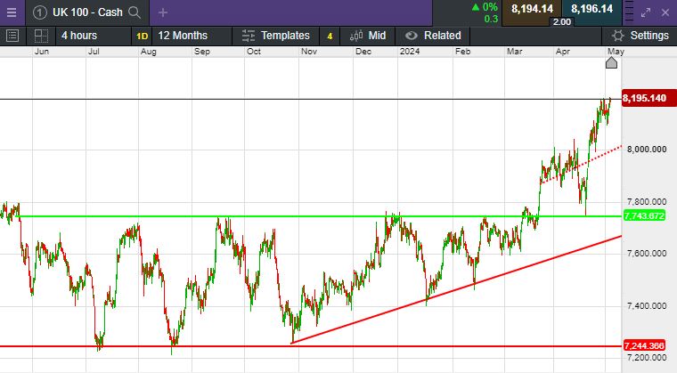 The UK 100 called to open +20 points at 8,192. The UK 100 looks set to open higher this morning having closed at another record high yesterday. Overnight, Apple picked up as it shrugged off reports of tumbling iPhone sales to post better-than-expected earnings and sales. Stocks Stateside rallied Thursday as investors looked ahead to more corporate earnings and a key labour report set for later in the week. The Dow Jones added 322.37 points, or 0.85%, to close at 38,225.66. The S&P gained 0.91% to settle at 5,064.20, while the Nasdaq surged 1.51% to end at 15,840.96.