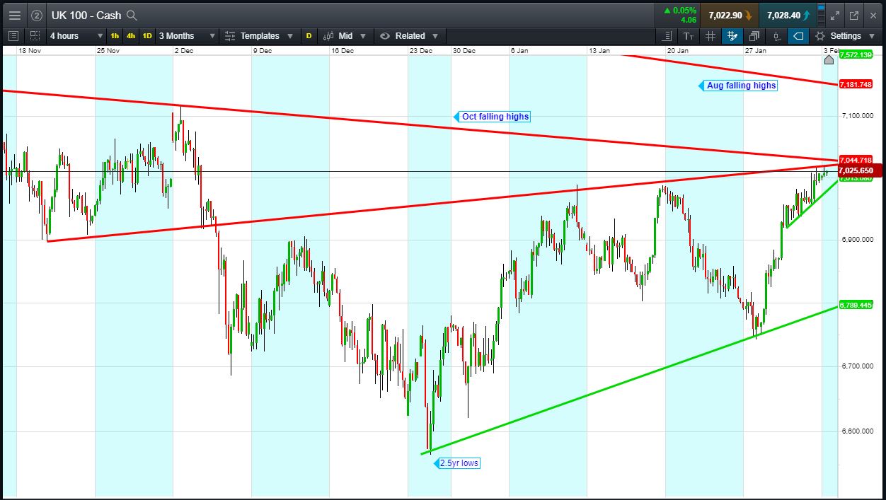 UK 100 called to open flat at 7020, holding 7000, just shy of 7033 overnight 2-month highs, at the ceiling of a 5-week up-channel. Bulls need a break above the 7035 ceiling, if not 7045 October falling highs resistance. Bears require a breach of 6990 rising support since 30 Jan. Watch levels: Bullish 7040, Bearish 6990