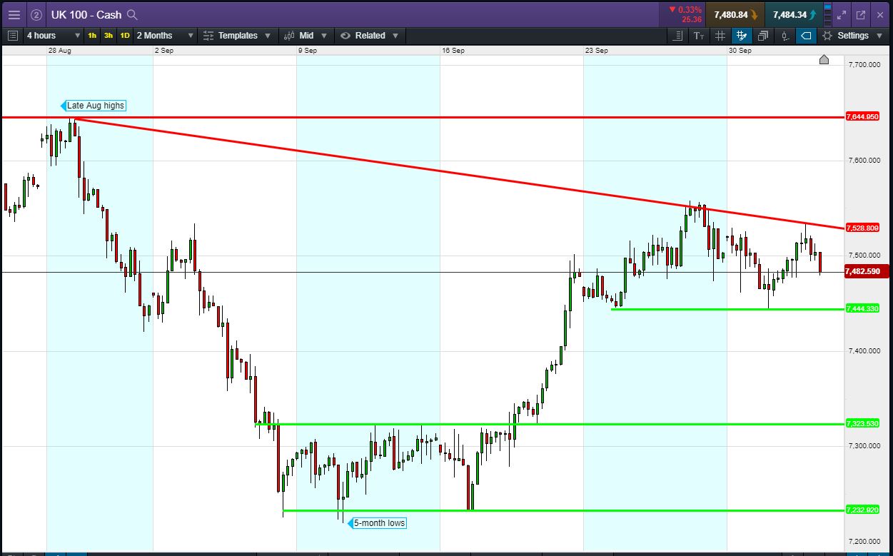 UK 100 Index called to open -30pts at 7480 (ex-dividends -7pts), back from yesterday’s late 7535 highs to confirm a trend of falling highs from late August that could keep the index under pressure. Bulls need a break above 7535; Bears require a breach of yesterday’s 7475 lows. Watch levels: Bullish 7535, Bearish 7475