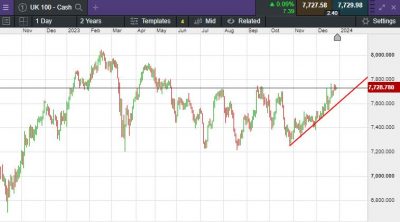 The UK 100 called to open +8 points at 7,690. The UK 100 is expected to open higher on Thursday after a downbeat start to the year. Overnight, US markets closed lower after Federal Reserve officials said interest rates would need to stay high for some time, although they indicated rates have peaked. The tech-heavy Nasdaq lost 1.18% to close at 14,592.21, marking its fourth consecutive losing day. The S&P slipped 0.80% to end at 4,704.81. The Dow Jones slid 284.85 points, or 0.76%, finishing at 37,430.19.