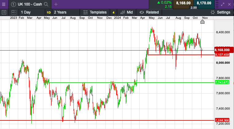 The UK 100 called to open -5 points at 8,172. The UK 100 looks set to open broadly flat from the close price from Friday.