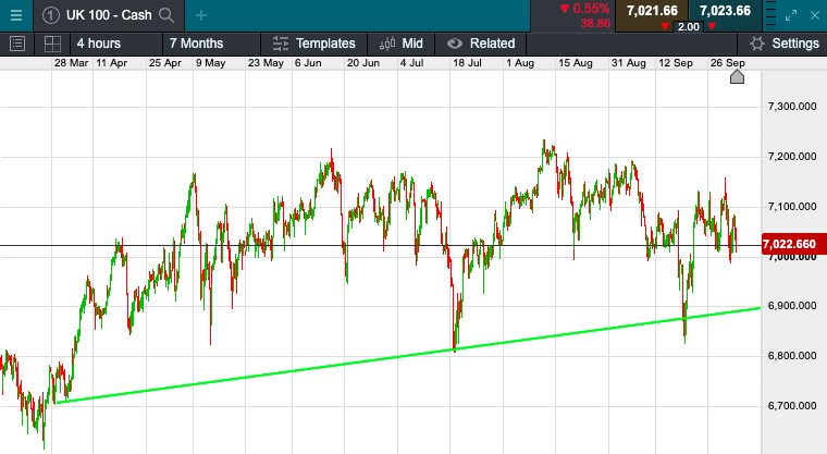 The UK 100 is called to open +3 points today at 7030. A marginally higher open is expected this morning as the UK bluechip index has bounced from overnight lows of sub 7000. This comes in-spite of growing Evergrande concerns as shares in the Chinese property group were suspended, Asian markets were mixed on Monday, with the Hang Seng index in Hong Kong tumbling more than 2%. China’s markets are closed for holidays and are set to reopen on Friday. In Japan, the Nikkei 225 fell 1.15%.