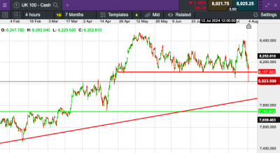 The UK 100 called to open -140 points at 8,034. The UK 100 looks set to open sharply lower this morning as global markets continue to sell off with Japan's Nikkei 225 closed 12.4% lower suffering its worst day since Black Monday amid fears of a US recession. Weaker than expected jobs and manufacturing figures in the US have raised concerns that the Federal Reserve have left it too late to begin cutting interest rates without damaging the economy.
