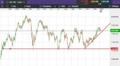The UK 100 called to open -50 points at 7,673.  The UK 100 looks set to give up all of yesterdays gains and then some this morning, as investors await the US jobs report for further clues as to the path of interest rates.  In the US on Thursday, Wall Street ended mostly lower, with the Dow Jones Industrial Average marginally higher, the S&P 500 down 0.3% and the Nasdaq Composite down 0.6%.