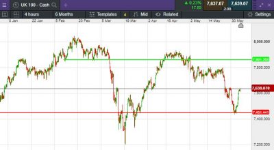 The UK 100 called to open +32 points at 7639. The UK 100 looks set to open the week on the front foot, this follows a strong showing for global markets on Friday and into Asia this morning. Sentiment seems to have changed after the US debt celling agreement passed through the senate late last week, calming concerns of a US default, and news over the weekend that Saudi Arabia will reduce how much oil it sends to the global economy, taking a unilateral step to bolster the sagging oil price. US markets soared on Friday with the Dow Jones climbing over 700 points while the S&P and Nasdaq also advanced strongly, while Asian markets climbed on Monday. In Tokyo, the Nikkei 225 index was up 1.9%. In China, the Shanghai Composite was down 0.1%, while the Hang Seng index in Hong Kong was up 0.2%.