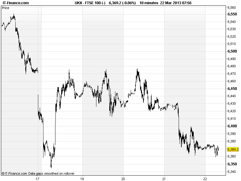 UK 100 down near lower of March trading range. Cyprus still dominant issue, meaning potential still there for a big move either way should we see worsening or resolution.