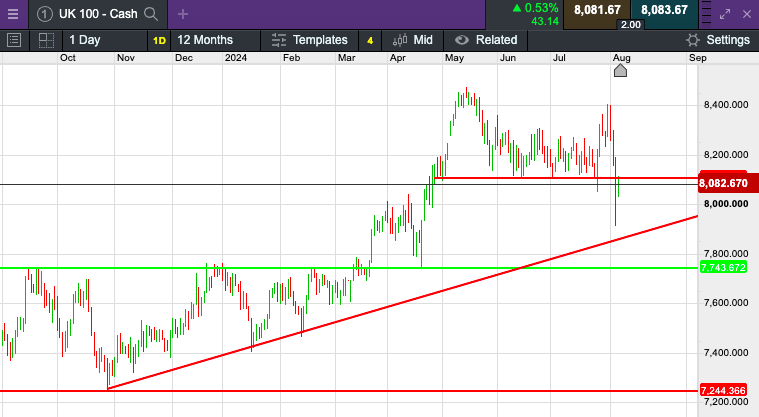 The UK 100 called to open +80 points at 8,088. The UK 100 looks set to rebound this morning, recovering some of yesterdays significant fall, part of a more global rout, which saw stocks across the world fall as concerns of a recession in the worlds largest economy grew. Having seen the largest fall since 1987 the Nikkei in Japan has recovered 10% this morning. Stocks fell sharply on Monday, with the Dow Jones Industrial Average posting its worst day in nearly two years. The Dow dropped 1,033.99 points, or 2.6%, to end at 38,703.27. The Nasdaq lost 3.43% and closed at 16,200.08, while the S&P 500 slid 3% to end at 5,186.33. The blue-chip Dow and S&P 500 registered their biggest daily losses since September 2022.