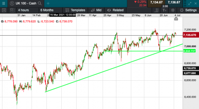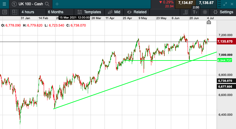 The UK 100 is called to open -30 points today at 7136.  A more muted open is expected this morning following yesterdays rally which was driven in main by financial and travel stocks in anticipation of yesterday evenings announcement of Covid-19 restrictions ending in the country.  Boris Johnson confirmed an end to Covid-19 restrictive measures in England on 19 July, along with all requirements to wear face masks and social distancing in places like pubs, providing a major boost to local companies.  Asian markets were mixed this morning, The Shanghai Composite in China dipped 0.54% and Hong Kong’s Hang Seng index slipped 0.43%. In Japan, the Nikkei 225 gained 0.27% while US markets will reopen today following yesterdays independence day holiday.