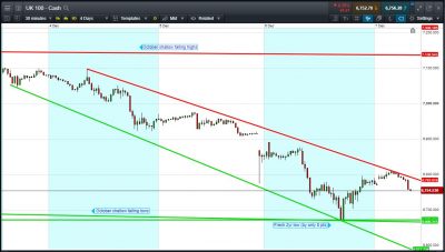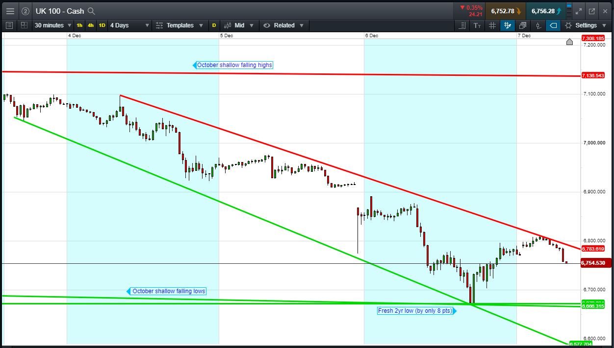 UK 100 called to open +45pts at 6750, after a 135pt rebound from another fresh 2yr low (6670) yesterday, but still hampered by a falling channel. Bulls need a break above 6790 to escape said channelm Bears require a breach of 6750 to extend it. Watch levels: Bullish 6790, Bearish 6750