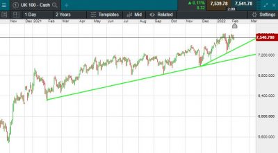 The UK 100 is called to open +25 points today at 7541. The UK 100 looks set to open the new trading week in the green, with the City largely ignoring Boris Johnson's long-running Whitehall farce, this also follows a mixed start in Asia. Mainland China returned from the lunar new year with a bang, while the Nikkei was hit by the weak performance from the industrials sector. Fridays session on Wall Street saw the S&P and Nasdaq advanced for their fifth positive session in the last six, and the indices also posted their best week since December. The Dow slid 0.06% on Friday, but still managed to post a 1.05% gain for the week. The Russell 2,000 meantime posted its first positive week in five and best week of 2022.