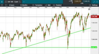 The UK 100 is called to open -15 points this morning at 7593. The UK 100 looks set to retreat on Tuesday after Prime Minister Boris Johnson scraped through a no-confidence vote overnight. Asian markets are mostly in the red this morning, led by the ASX after the Reserve Bank of Australia raised its headline interest rate by half a percentage point, a bigger move than expected, following a quarter point move a month ago. Wall Street’s main indices finished slightly higher overnight, having been significantly higher earlier in the session, the Nasdaq climbed 0.4%, the S&P 500 0.3% and the Dow Jones was only just above flat.