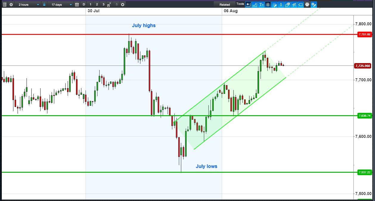 UK 100 Index called to open -10pts at 7709, back near the floor of a 5-day rising channel towards end-July highs. Bulls need a break above overnight highs of 7735. Bears require a breach of rising support around 7700. Watch levels: Bullish 7735, Bearish 7700