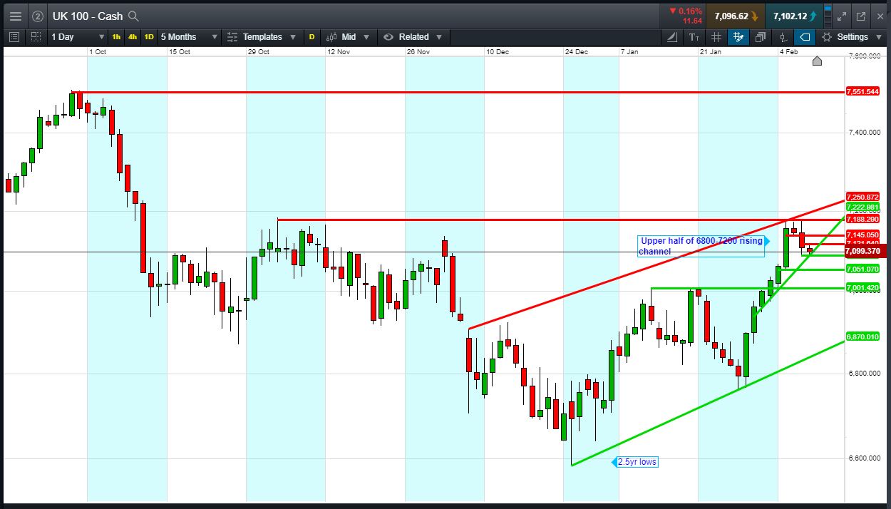 UK 100 called to open flat at 7095, back from 2019 highs of 7188 but, for now, still in the upper half of Jan’s 6800-7200 rising channel and holding Feb rising support at 7100. Bulls need a break above 7121 overnight highs to revive and extend Feb’s uptrend. Bears require a breach of 7090 overnight lows support to extend the pullback. Watch levels: Bullish 7125, Bearish 7095.