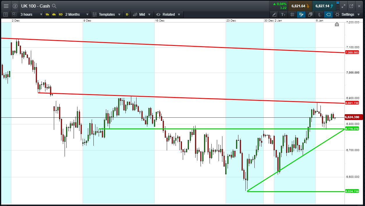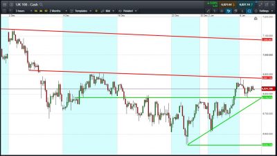 UK 100 called to open +5pts at 6815, holding just below the mid-point of a 2-day 6780-6880 range. Bulls need a break above 6845 overnight highs if they are to challenge 1-month falling highs resistance at 6880. Bears require a breach of 6805 overnight lows for a revisit of Friday’s breakout zone. Watch levels: Bullish 6845, Bearish 6805
