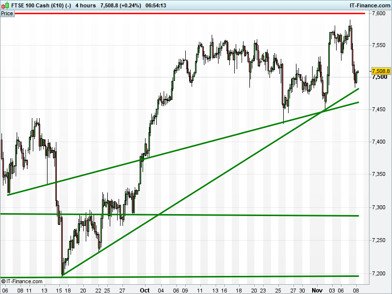 UK 100 Index called to open flat at 7513, having bounced from an overnight test of 7500 to bolster the trend of rising lows since mid-October. Bulls are looking for a rebound towards 7600. Bears need another test of 7500 and rising support. Watch levels: Bullish 7520, Bearish 7500.