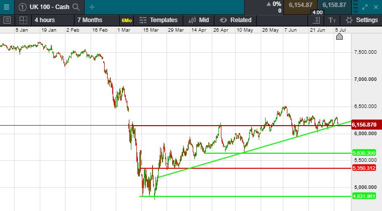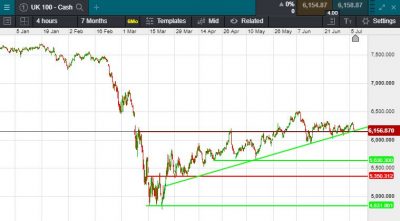 UK 100 called to open -50 points this morning at 6139. Calls for a negative open come as the number of new cases of Coronavirus again rose in several different parts of the world. Concerns saw sentiment weakened and a mixed trading session in Asia, In Japan the Nikkei 225 down 0.58% while in Hong Kong, the Hang Seng rose 0.54%. Yesterday in the US, The Dow closed 1.5% lower at 25,890 overnight, while the S&P 500 fell 1.08% to 3,145 and the Nasdaq dropped 0.86% to 10,343. In focus today will be UK’s ‘mini-budget’ later on Wednesday, where the Chancellor Rishi Sunak is expected to unveil a raft of measures designed to help stimulate the British economy out of its pandemic slump. Brent crude trades at $42.98 a barrel, down 0.23%, while Gold changes hands at $1,794 an ounce, down 0.01%.