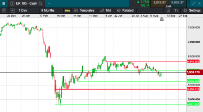 UK 100 called to open +25 points this morning at 5961. Calls for a positive open this morning come as Brexit talks restart. Yesterday saw a bounce from Fridays fall in the FTSE, adding over 100 points during the session to settle once more over 5900 at the close, with US Markets closed on Monday for labour day, focus will be on whether there is a continuation of Fridays afternoons bounce when markets recommence trading today at two thirty.