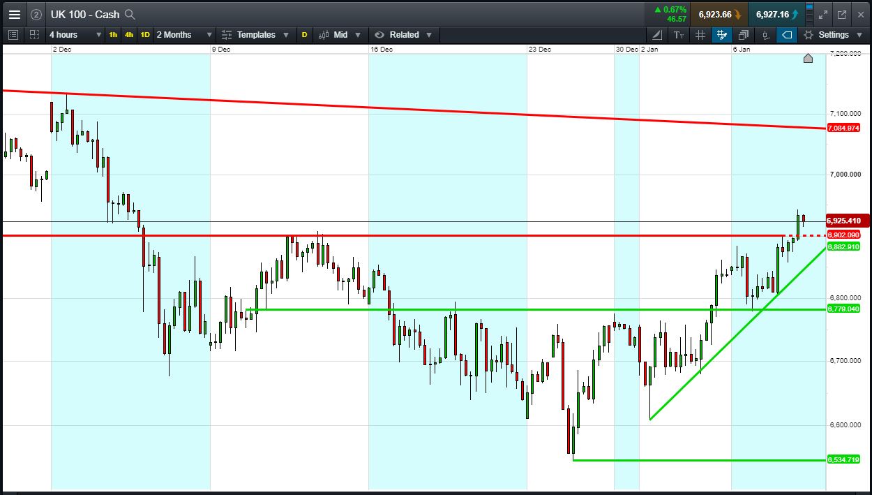 UK 100 called to open +55pts at 6915, holding the break above 6900 although back from 6945 highs. Bulls need a break above 6850 to stay on track for a 7000 challenge and 3 month falling highs at 7082. Bears require a break back below 6900. Watch levels: Bullish 6850, Bearish 6900