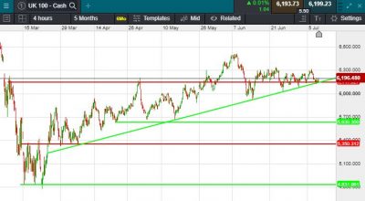 UK 100 called to open +30 points this morning at 6189. This comes as overnight the latest Chinese economic stats (June CPI) arrived precisely on the market’s forecasts and expectations helped investor sentiments on the positive side this saw Japan’s Nikkei gain 124 points or 0.55% to 22,562, while in Hong Kong’s Hang Seng similarly rose by 108 points or 0.4% to 26,237 and the Shanghai Composite moved 1.28% higher to 3,447. In the US Wednesday saw Wall Street benchmarks market positive sessions. The Dow Jones climbed 0.68% to end at 26,067, whilst the S&P 500 was 0.78% higher at 3,169. Focus today will later today focus on German (trade) and US (weekly jobs) data.