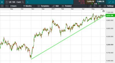 UK 100 is called to open -12 points this morning at 7083. Calls for a marginally weaker open this morning come on the back of a jump in Chinese inflationary figures for May. Asian markets reacted accordingly, with Japan’s Nikkei down 0.33% while Hong Kong’s Hang Seng fell 0.16%. It was a more mixed performance yesterday Stateside, with the Dow Jones closing down 0.09% at 34,599 while the S&P 500 rose 0.02% to 4,227 and the Nasdaq was up 0.31% at 13,924.