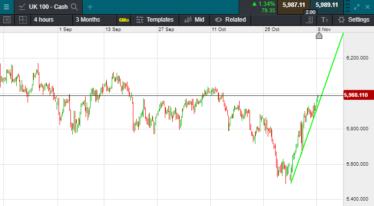 UK 100 called to open +90 points this morning at 5990.  Calls for a positive open come on the back of Joe Biden being declared the incumbent President of the United States over the weekend.  A Biden presidency is likely to see a more conciliatory approach to international trade along with a concerted effort to get the rampant coronavirus outbreak under control & with the Republicans retaining the Senate it appears unlikely his package of tax hikes will go through.  Stocks in Asia-Pacific surged today, In Japan, the Nikkei 225 gained 2.12%.  Chinese stocks also surged with the Shanghai composite up 1.7% while Hong Kong’s Hang Seng index advanced 1.42%.  Dow futures are already spiking, with the US index 300 points higher at 28,700.