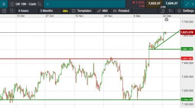 UK 100 called to open +2 points points at 7625; This comes on the back of another positive trading day yesterday for the UK Index , seeing the UK bluechip index gaining another 41 points. Overnight trading in Asia was mixed but as to be expected this close to Christmas, somewhat muted, the Nikkei closing at 23,830 (+9 points) and the Hang Seng closing at 27, 864 (-42 points). It was more buoyant in the US yesterday, seeing the Dow Jones closing at 28,551, another fresh record high (+96 points). The Nasdaq closing at 8,945 (+20 points) and the S&P 500 completing the green sweep at 3,224 (+3 points). Oil recovered from yesterdays lows to trade at $66.7 per barrel. Whilst gold continued to creep higher, trading at $1490.